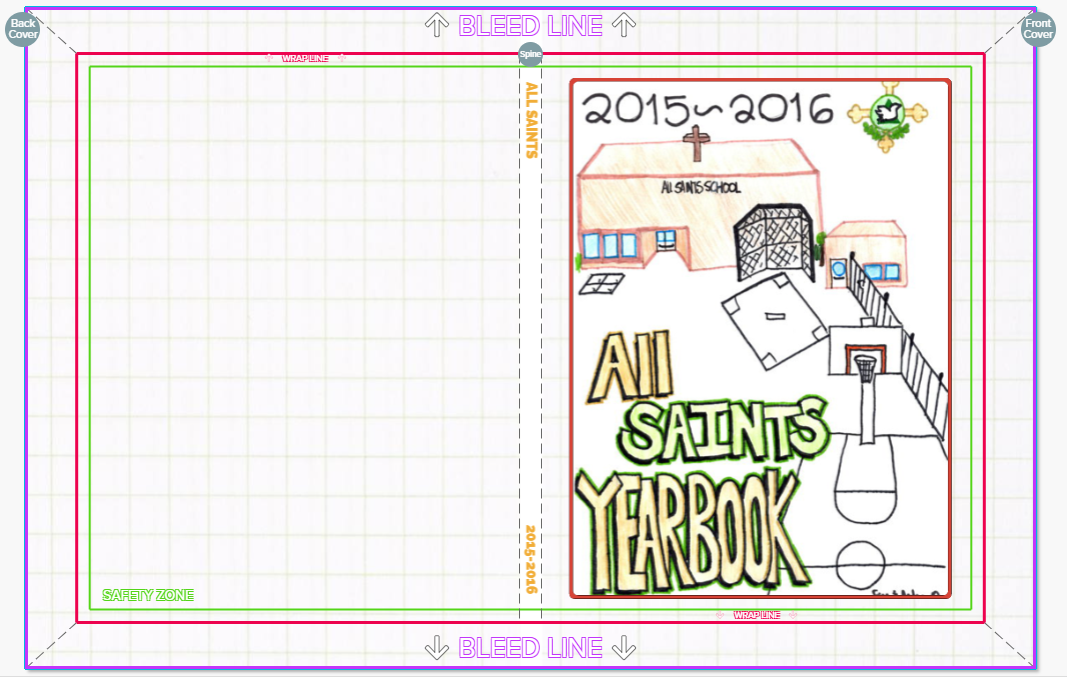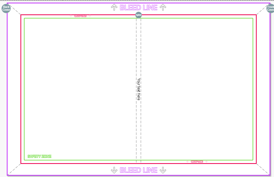 When designing your cover, you will see colored guideline borders that represent critical print boundaries. These lines help you place content correctly so nothing important gets trimmed, wrapped, or misaligned during production.