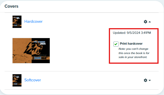 Uncheck the “Print Hardcover” or “Print Softcover” checkbox to disable that cover type.