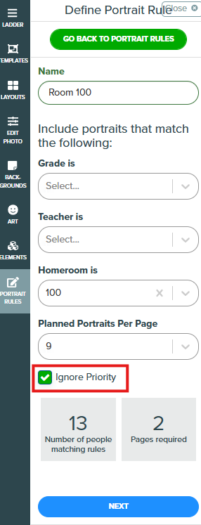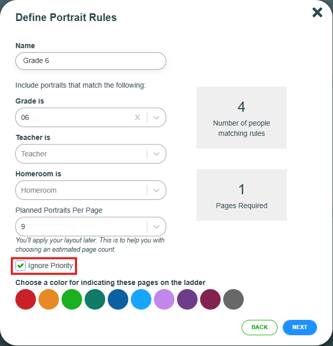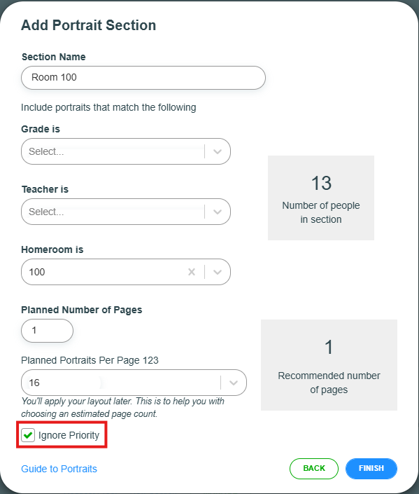 Priority controls the order portraits appear. Lower numbers show first, making it easy to highlight teachers, seniors, or standout students.