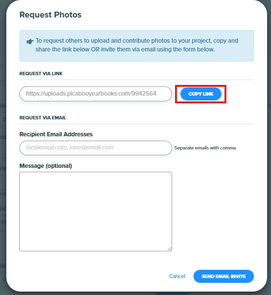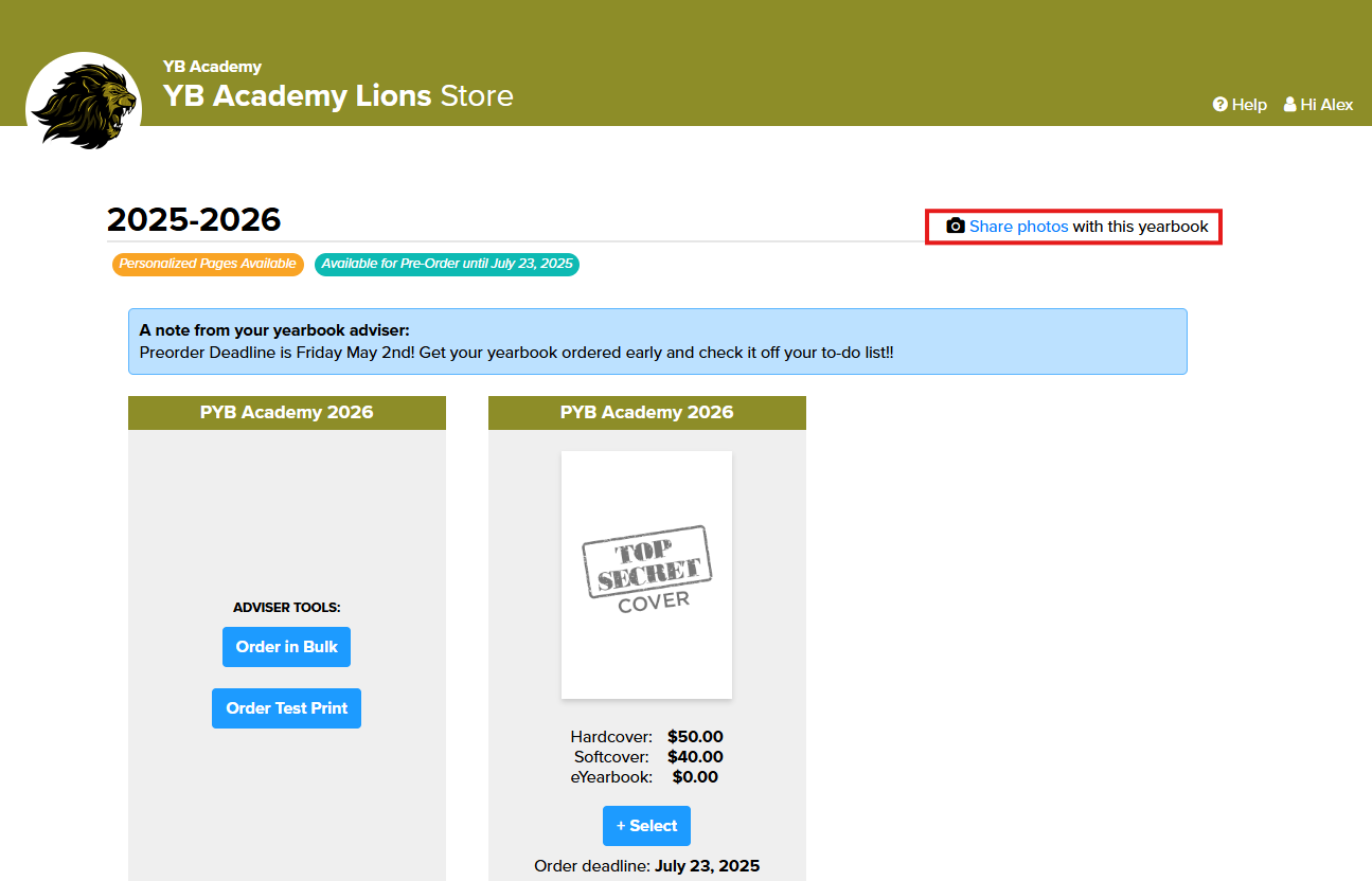 Share your storefront URL with parents, students, and staff. Encourage them to click “Share Photos” to contribute.