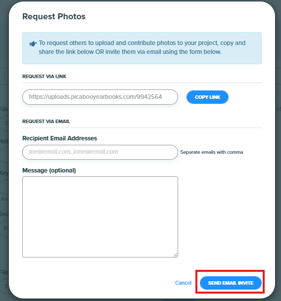 Contributors will receive an email with your message and a direct upload link.